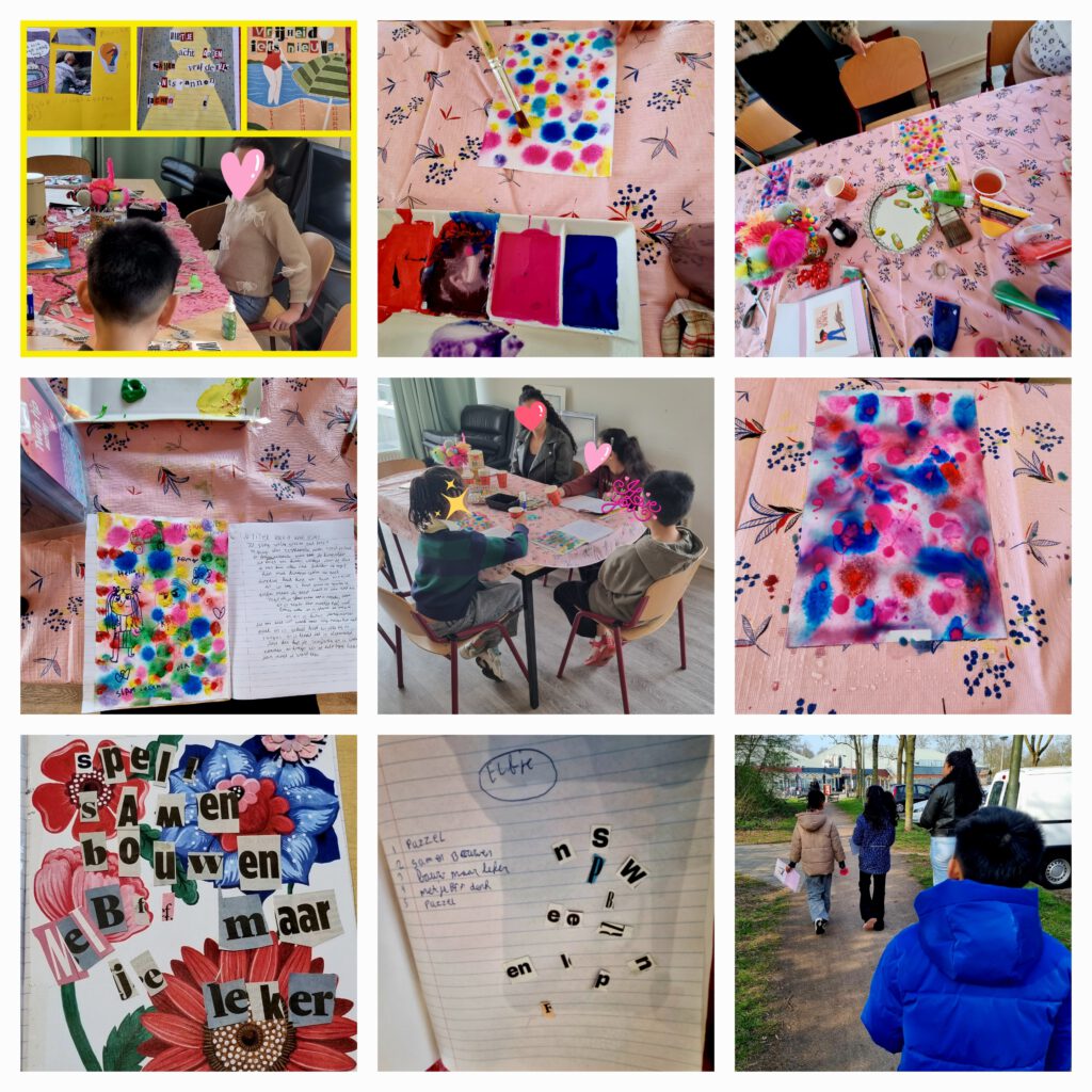 vorm met dromerige nat-in-nat techniek (schilderen), krantenknipcollages en gedichten. Heel fijn om zo samen bezig te zijn. Tussendoor vingen ze als geluksdetectives verhalen op straat. Alles kreeg een plek in hun eigen Krachtboek: een mooi eindwerkje van alles wat ze hebben gemaakt. Echt iets om trots op te zijn.