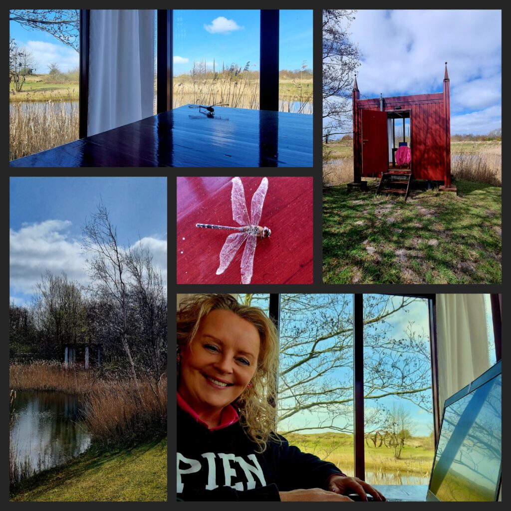 In de verte piepen en kraken metalen sculpturen. Ik zit binnen in een schrijvershuisje met rondom ramen, aan een bordeauxrood gelakte tafel. Vanuit hier kijk ik uit op het riet dat rustig beweegt in de wind. Daarachter ligt een maanvormig water.